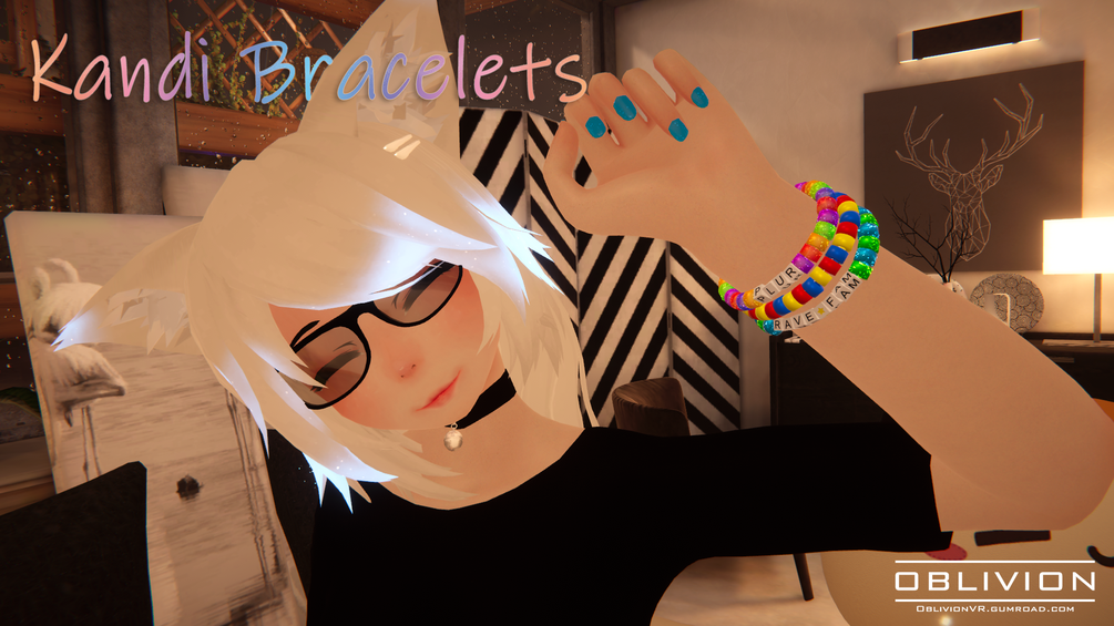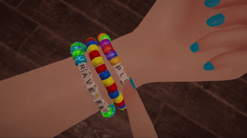 A set of 3 kandi raver bracelets for VRChat. PLUR! (Peace, Love, Unity, Respect)
